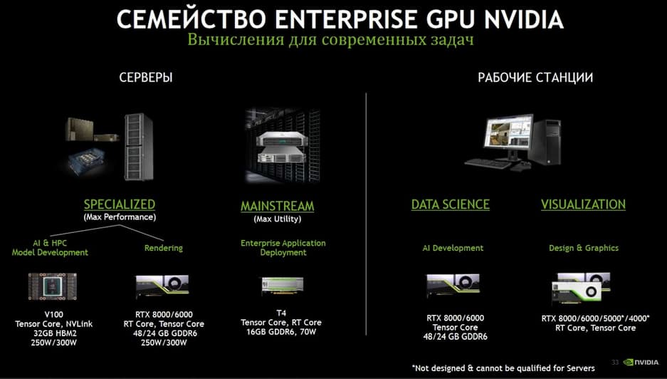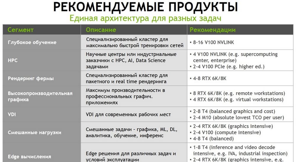 Здесь значительно больше продуктов и представлено их рекомендуемое вендором позиционирование. Тем не менее здесь перечислены все основные задачи, начиная с глубокого обучения нейронных сетей (кластер для максимально быстрой тренировки сетей), классическое HPC, рендеринг (кластер для пакетной и real time обработки), VDI нагрузки, применение для Edge-компьютинга. Это рекомендации вендора, выбор же всегда остается за заказчиком. Тем не менее это некая статистика и рекомендации, которые накоплены за последние пару лет, исходя из наблюдения за тем, как продукты Tesla V100 или Tesla T4 в основном применяются заказчиками.