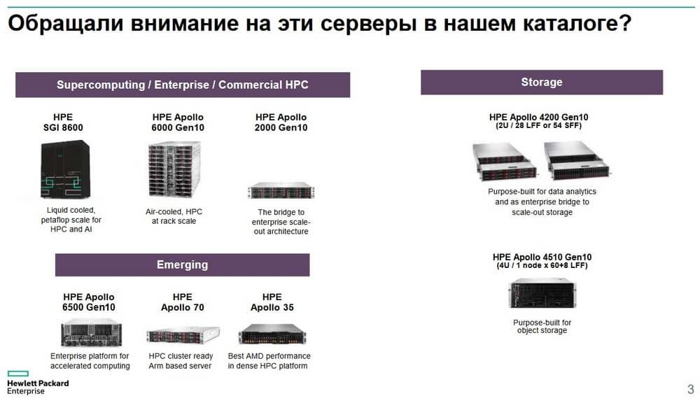 У HPE есть серверы для вычислительных кластеров, для более компактной замены стандартным серверам рэкового исполнения и есть серверы, которые подходят для систем хранения данных.