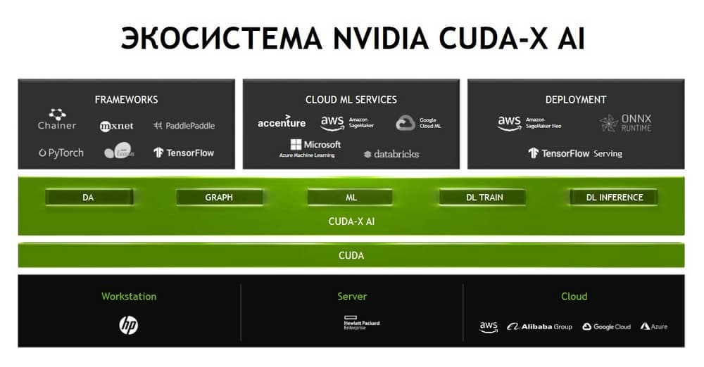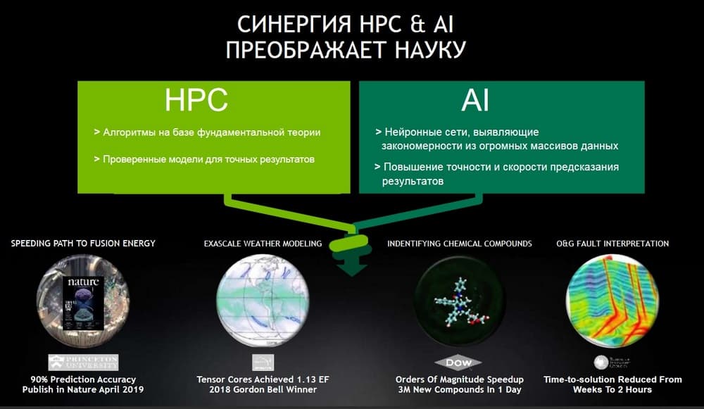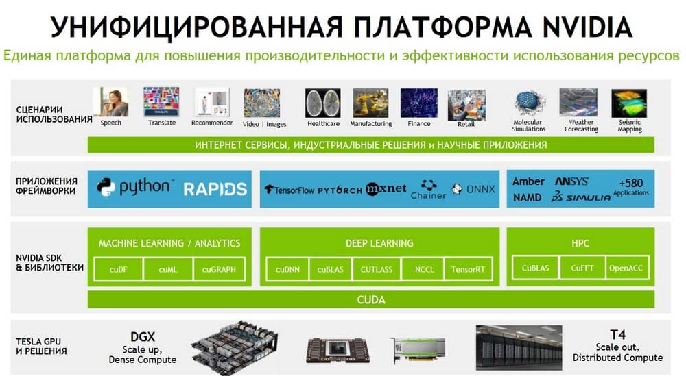 И здесь нужно отметить, что традиционно нас, как вендора, ассоциируют как производителя и разработчика графических процессоров, или, проще говоря, "железа". И это верно. Но при этом нужно понимать, что ничуть не меньший вклад в достижения, который приносят графические процессоры, вносит огромный объем сложного софта, который вендор разрабатывает и предоставляет сообществу и пользователям. Этот софт дальше интегрируется в те или иные программные инструменты. Это может быть поддержка как внутри классических HPC-приложений, так и поддержка разработки тренинга и применения нейронных сетей. Естественно, возникает огромное число различных библиотек для разных предметных областей. «Железо», и в нашем случае GPU, это важно, нужно, но при этом стоит помнить, что все это было бы совершенно бесполезным куском кремния, если бы не было такой большой поддержки со стороны разработчиков софта.