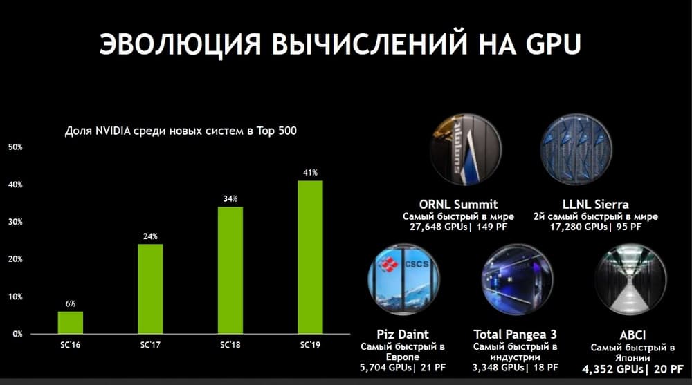 Приятно отметить, что среди всех новых систем, которые появились в последней редакции списка TOP 500 серверов, 41% систем построен с использованием графических процессоров. Если это было в диковинку еще пять-семь лет назад, то теперь GPU является привычной частью инфраструктуры центра обработки данных. Процент, это конечно, хорошо, но важно отметить, что все суперкомпьютеры, носящие имя «номер один», построены именно на базе графических процессоров. Это и самый быстрый суперкомпьютер в США и второй самый быстрый суперкомпьютер в США, и самый быстрый суперкомпьютер в Европе, в Японии, в индустрии, в России. Т.е. мы видим, когда заказчикам необходимы массивные инсталляции под большие сложные вычисления, это могут и быть вычисления, связанные с решением задач, использующих те или иные элементы искусственного интеллекта, GPU стали уже просто незаменимыми.