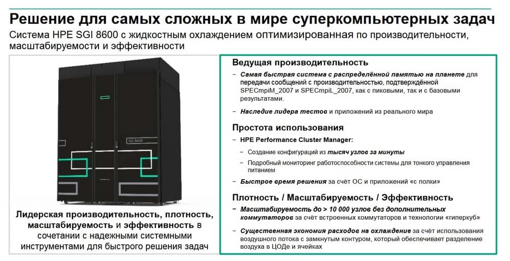 Система, которую вендор получил вместе с покупкой компании SGI, - это серверная платформа HPE SGI 8600 для вычислительных кластеров с водяным охлаждением. Система мощная, побила несколько мировых рекордов, и пользуется огромной популярностью, но пока только за пределами России.