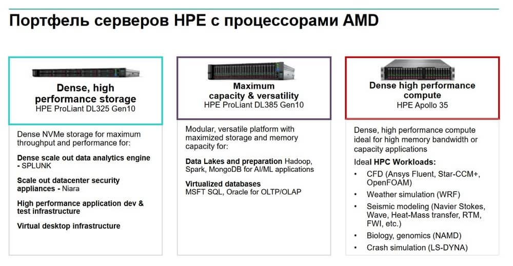 Она входит в один ряд с серверами, которые постепенно набирают свою популярность, возвращая свое место в портфеле HPE после некоторого перерыва. Сейчас у AMD есть хороший портфель процессоров и количество платформ на базе AMD в портфеле HPУ будет продолжать увеличиваться. Эта платформа по сути аналогична платформе Apollo 2000, но сделана на базе процессоров AMD.