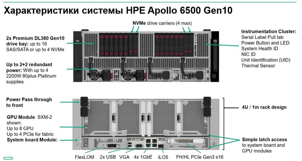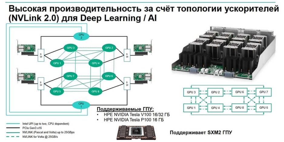 Формат шасси - 4 юнита. Все это помещается в стандартную стойку глубиной 1 м. Высокая производительность достигается за счет топологии ускорителей (NVLink 2.0) для Deep Learning /AI. Поддерживаемые ГПУ: HPE NVIDEA Tesla V100 16/32 Гбайт, HPE NVIDEA Tesla P100 16 Гбайт и SXM2 GPU.