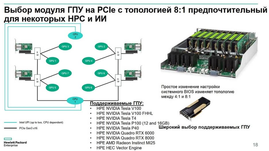 При этом 8 карт HPE NVIDEA Tesla V100 могут подключаться либо к одному центральному процессору, либо разделяться между двумя центральными процессорами в соотношении 4:1. Изменить это можно с помощью настроек в BIOS. Это дает пользователям гибкость в выборе формата вычислительных узлов, которые наиболее приемлемы для той или иной задачи.