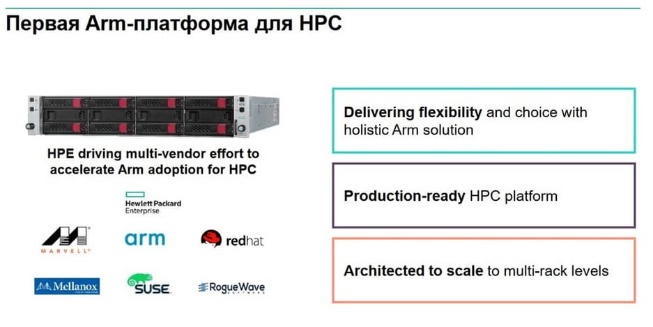 Еще один момент, на который хочется обратить внимание, что с одной стороны мы, как вендор, стараемся быть представленными на всех вычислительных платформах с точки зрения архитектуры центральных процессоров, а с другой стороны, нам важно чтобы у заказчика всегда была альтернатива. Мы не хотим диктовать заказчикам на какой платформе им необходимо наиболее эффективно и правильно решать свои задачи. И если до недавних пор линейка процессоров и архитектура ARM с точки зрения высокопроизводительных GPU оставалась непокрытой, то в настоящее время эта недоработка устранена. И теперь все архитектуры центральных процессоров поддерживают возможность добавления к ним GPU как ускорителя для вычислений. Выше уже упоминалось про одну из моделей в линейке HPE, которую вендоры сделали совместно, и которая содержит в себе процессоры на базе HPE NVIDEA Tesla V100. Мы надеемся, что те заказчики, для которых поддержка ARM и ARM-платформ является интересной, теперь смогут использовать все те возможности, которые предоставляют им графические процессоры.