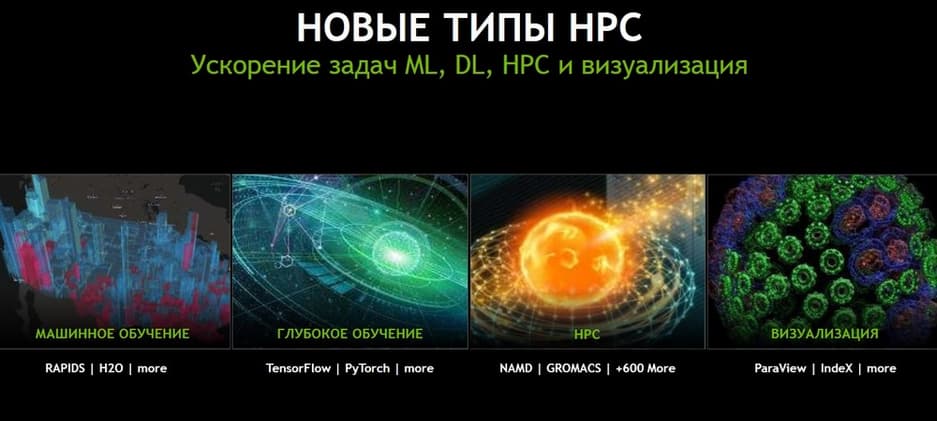Причем они могут играть функцию действительно ускорителей для графики, когда десктоп или приложение будут быстро что-то отрисовывать и также, как было на физическом рабочем месте, так и в тех случаях, когда виртуальное рабочее место используется как рабочее место разработчика того или иного приложения с элементами искусственного интеллекта. Поэтому теперь видно, что грань между HPC и машинным обучением, визуализацией, на самом деле очень сильно размывается и требования к решению подобного рода задач становятся очень похожим друг на друга.