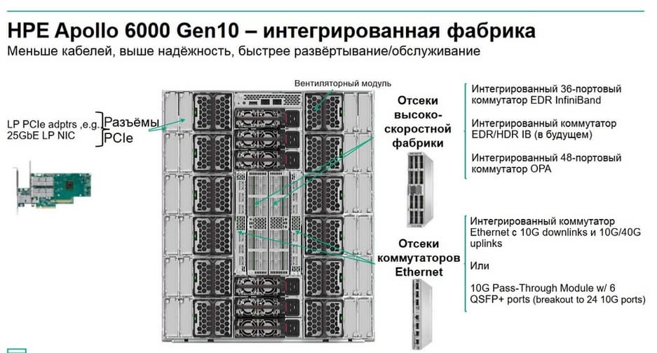 Поиски неполадок, связанных с некорректным подключением кабелей, являются рутинной и неприятной задачей как во время пуска-наладки, сборки и установки таких систем, так и для системных администраторов во время их эксплуатации. Чем меньше кабелей в HPC-кластере, тем лучше. Шасси Apollo 6000 как раз и позволяет уменьшать количество кабелей, и устраняет целый уровень кабельной инфраструктуры.