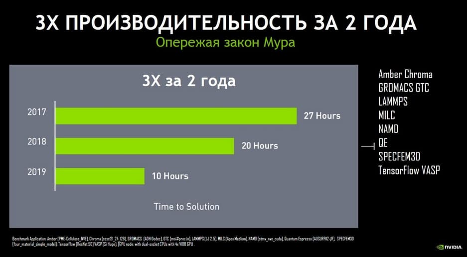 Рассмотрим интересный пример. Если взять топ из 10 классических HPC-приложений и оценить эволюцию этих приложений за последние 2 года. Важная оговорка: в течение последних 2-х лет вендор по сути не обновлял свою вычислительную архитектуру, т.е. уже больше 2-х лет используется именно архитектура Вольта, которая материализована в таких продуктах, как HPE NVIDEA Tesla V100. Таким образом при том же самом «железе» производительность этих топ-10 приложений за это время выросла в 3 раза.