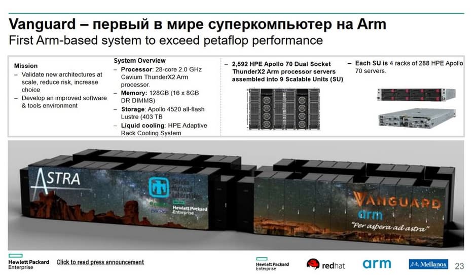 На Arm был построен первый мире суперкомпьютер Vanguard. В него вошло почти 2600 узлов Apоllo 70. Как он выглядит, можно увидеть на следующем слайде. В нем порядка 40 стоек с такими серверами.