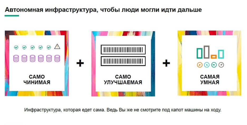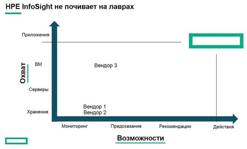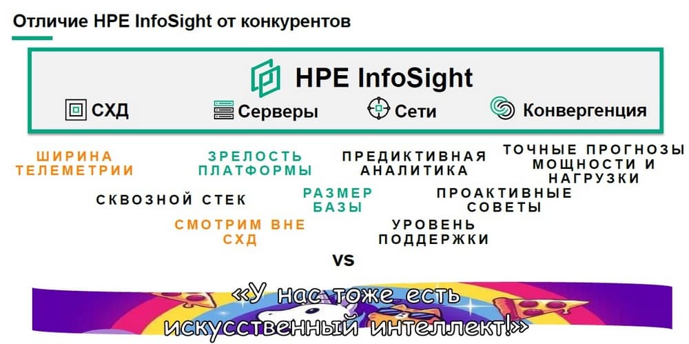 Основное отличие от конкурирующих систем заключается в величине сырых данных, которые использует искусственный интеллект, величина базы очень важна для правильного машинного обучения. InfoSight следит практически за всей инфраструктурой, за сетями она сейчас следит опосредованно через платформу виртуализации, но в ближайшем будущем научится следить за ними напрямую, здесь имеется в виду в первую очередь портфель HPE ARUBA.