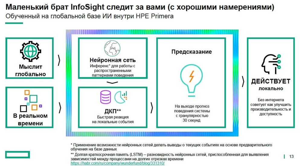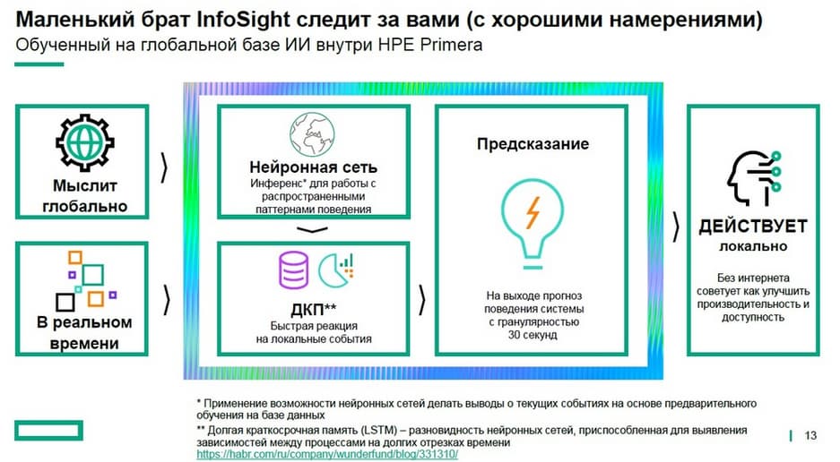 Интерфейс HPE Primera идет еще глубже в сам массив и сейчас механизм строится на двух разных реализациях машинного обучения. Во-первых, это нейронная сеть, обученная на базе InfoSight отлавливать тысячи наиболее распространенных сценариев – что может пойти не так в инфраструктуре, в СХД и о чем нужно предупредить пользователя и принять определенные корректирующие действия. Во-вторых, это независимая система с долгой и краткосрочной памятью, она обучается на локальной базе событий, чем дольше она работает, тем лучше она может предсказывать поведение приложений, отдельных компонентов инфраструктуры и выдавать прогноз с довольно высокой точностью, с гранулярность 30 секунд может указать время возникновения какого-то события.