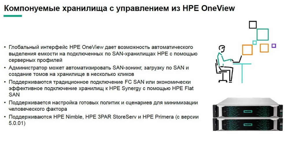 Если раньше в портфеле HPE лучшими друзьями были 3PAR и Synergy, то сейчас таковыми стали 3PAR, Primera, Nimble и Synergy. Все они вместе поддерживают REST API и на всех их доступна из одной консоли управления OneView, которая управляет вычислительными и сетевыми ресурсами, также доступен SAN-зонинг.