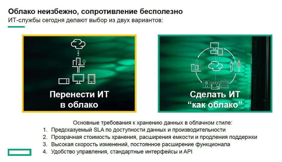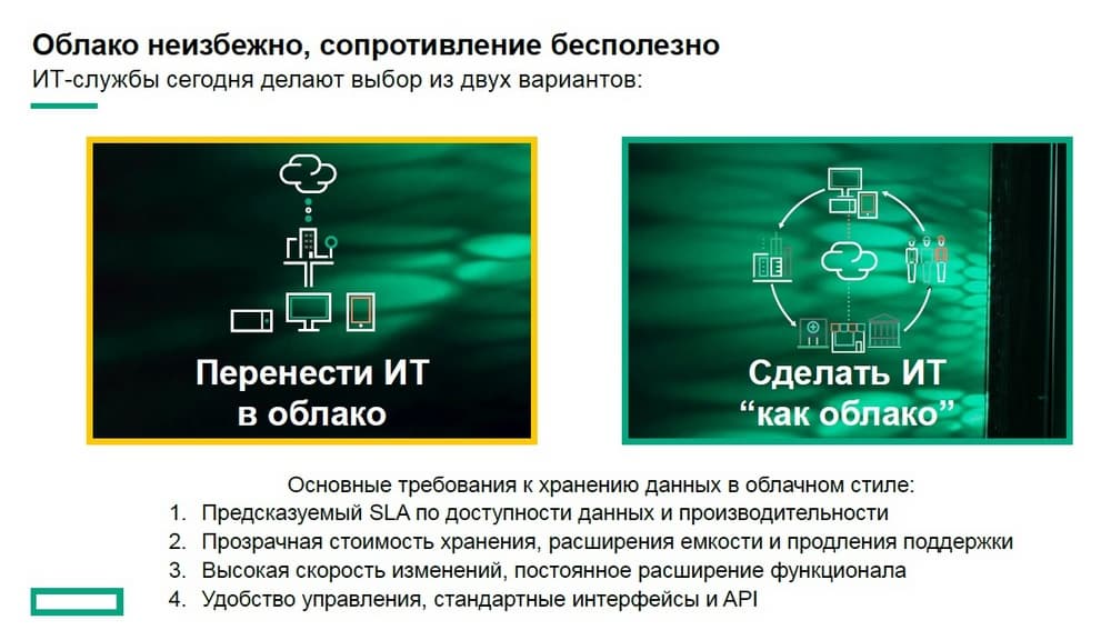 Общая идея, которую HPE вкладывает в развитие систем хранения данных, опирается на два выбора, которые по мнению аналитиков Gartner должны сделать заказчики, пользующиеся информационными системами: либо свои ИТ-сервисы перенести в облако типа Amazon, Google, Azure, либо свои ИТ-сервисы оставить в своей инфраструктуре, но свою инфраструктуру сделать как облако.