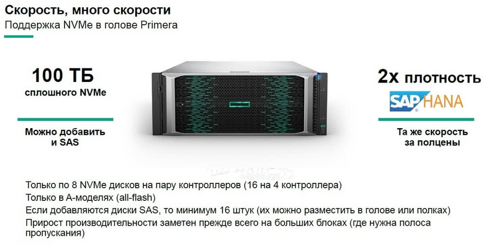 Если сказать про дальнейшие шаги в повышении производительности, то начиная с июля 2020 года вендор поддерживает установку NVMe-накопителей в Primera.
