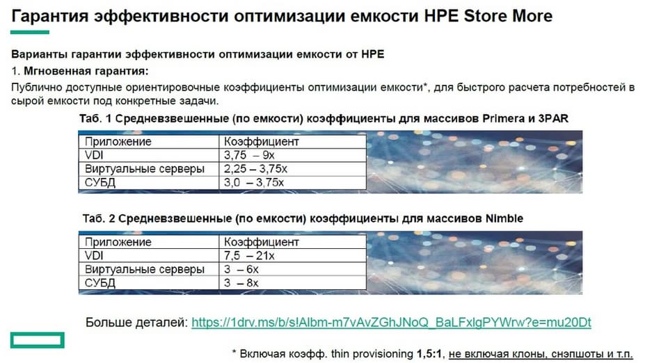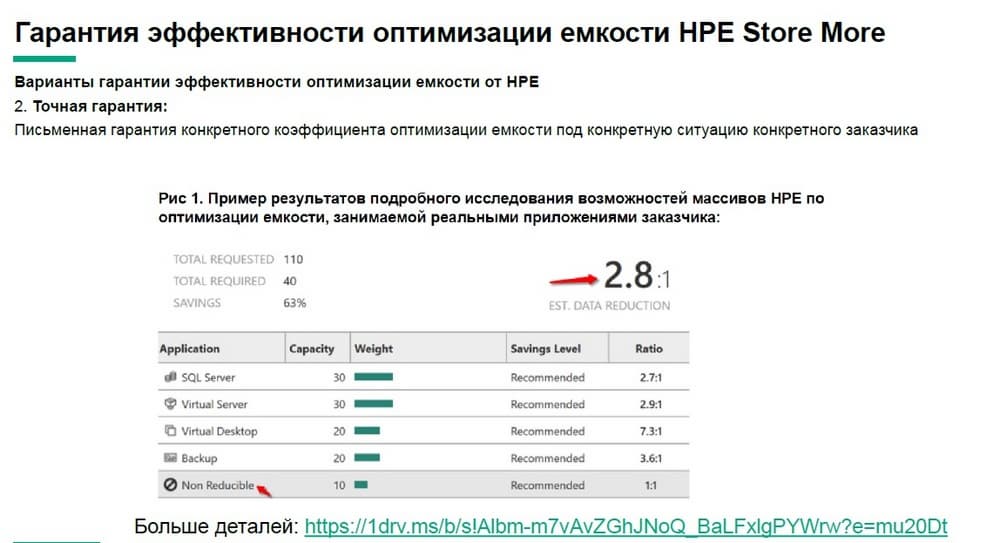 По словам Алексея Казьмина нужно чаще пользоваться гарантиями, одна из них - HPE Store More, по которой вендор заказчику гарантирует, что данные, хранящиеся на СХД будут сжаты и дедуплицированы, если, естественно, это возможно сделать. Под эту гарантию не попадают зашифрованные данные, уже чем-то сжатые, медиа-данные и т.д.