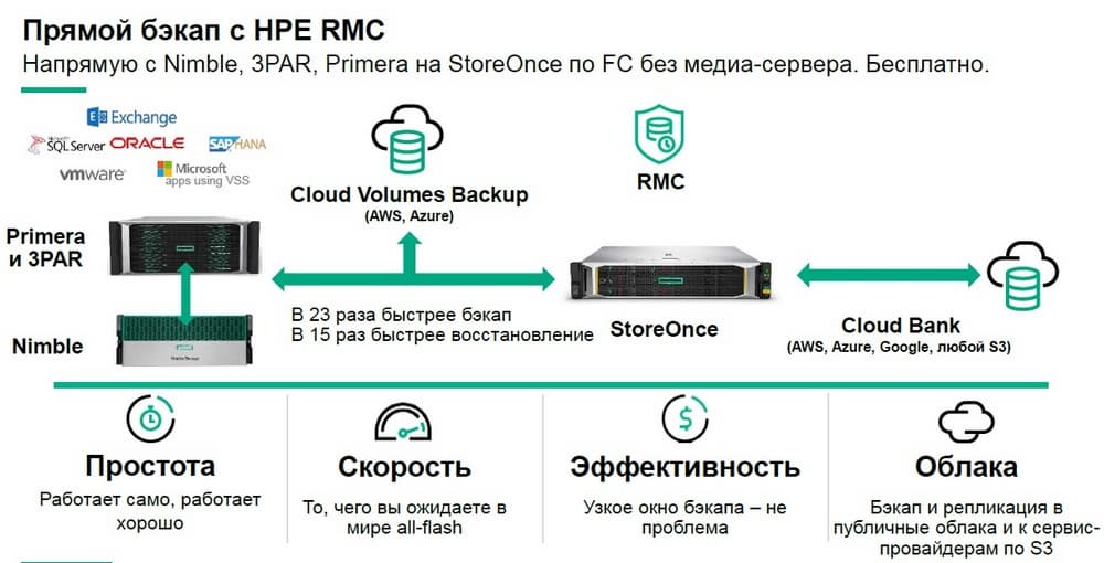 Несмотря на то, что HPE Primera имеет стопроцентную доступность, но далеко не только СХД может выйти из строя, может упасть и какой-то ИТ-сервис. С всеми системами хранения HPE, такими как 3PAR, Primera, Nimble и дисками библиотеки StoreOnce бесплатно поставляется софт, который называется Recovery Manager Central (RMC). Он представляет собой виртуальную машину не требовательную к ресурсам и она может оркестрировать, управлять снятием мгновенных снимков силами самой системы хранения, делать это консистентно с очень большим перечнем приложений и эти снимки RMC может складывать либо на StoreOnce, на нашу дисковую библиотеку для хранения бэкапов и делает он это напрямую, за счет этого и появляются дикие цифры прироста производительности по сравнению с классическим ПО резервного копирования.