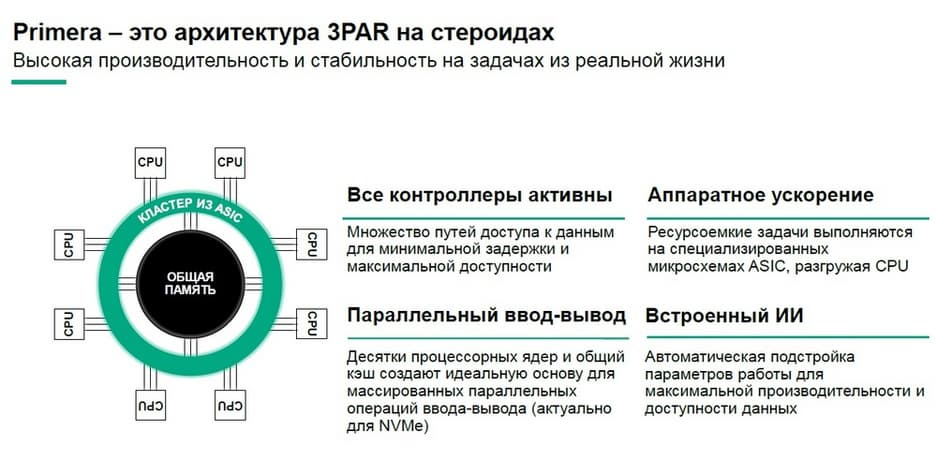 Естественно, HPE Primera совместима с HPE InfoSight. Что же Primera взяла от 3PAR? Она взяла архитектуру со всеми активными контроллерами и доступ осуществляется к любому тому сразу через все доступные контроллеры. В HPE Primera кэш-память общая для всех контроллеров (на запись и на обработку данных) и это позволяет меньшее количество раз перекладывать данные из одного кэша в другой и обратно, чем обеcпечивать большую производительность системы. В HPE Primera еще более расширилась полоса пропускания между контроллерами и она составляет 2 Тбит/с, один контроллер с другим может общаться на такой скорости, это необходимо для начала поддержки накопителей NVMe, которые были анонсированы в июле 2020 года. Дистрибьютор HPE компания Treolan уже заказала демосистему на NVMe-накопителях. Для нормальной поддержки NVMe полоса пропускания между контроллерами должна быть гораздо выше, чем это было в системах хранения предыдущего поколения. Еще Primera взяла от 3PAR специализированные микрочипы ASIC, в старших моделях Primera по несколько штук на каждый контроллер, они по-прежнему берут на себя самые ресурсоемкие задачи, но также еще и служат коммутаторами, которые связывают контроллеры между собой по прямой PCI-Express шине. Сделать что-то быстрее, чем прямая PCI-Express шина на данный момент невозможно, что, напомню, обеспечивает большую полосу пропускания. Еще одна особенность, которая появилась в прошивке версии 4.2, это встроенный искусственный интеллект.
