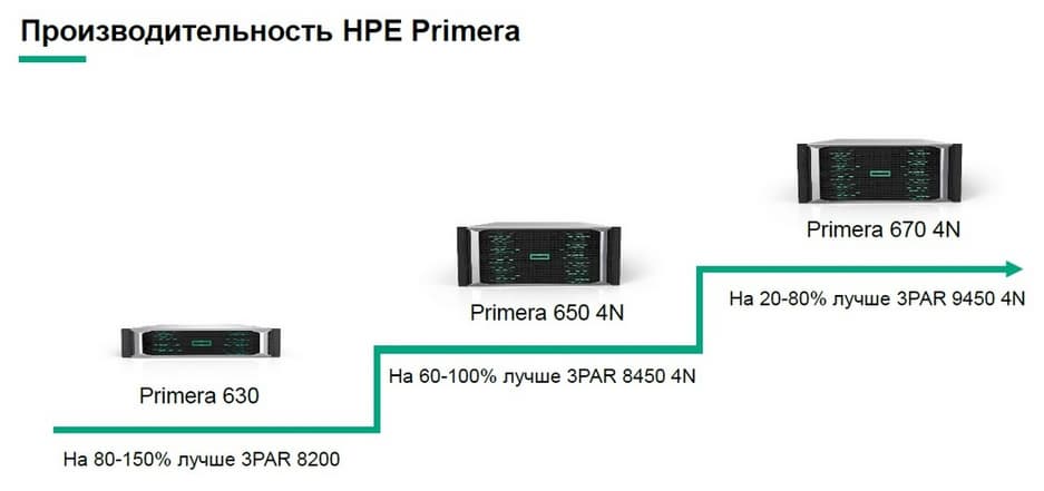HPE Primera – это гораздо более производительный массив, чем 3PAR, если рассматривать сравнимые модели. Пока нет в линейке HPE Primera прямой замены 20000-м 3PAR, тем, в которых больше 4 контроллеров, но совершенно точно есть замена 8000-м и 9000-м.