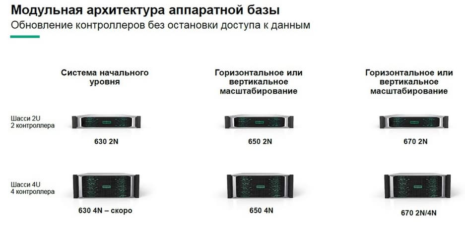 Модульная архитектура аппаратной базы в HPE Primera – это еще одно наследование системы Nimble и еще важное отличие от систем 3PAR. В Primera есть два типа шасси – двухюнитовое и четырехюнитовое (соответственно 2 или 4 контроллера).