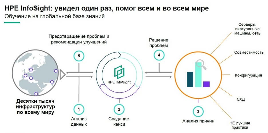 HPE InfoSight – это глобальная база знаний, постоянно собирающая телеметрию с десятков тысяч подключенных устройств и их окружений по всему миру, это сбор информации с систем хранения, серверов и виртуальных окружений через интеграцию с платформами Veeam и HipрerVe, пока только для систем HPE Nimble поддерживается HipрerVe, но для других систем также будет поддерживаться чуть позже.