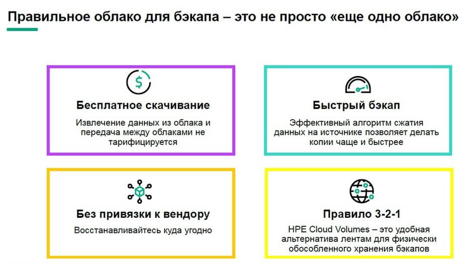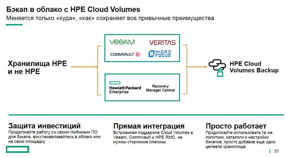 С хранилок HPE это можно делать через RMC, а с наших и других хранилок можно это сделать с помощью софта Veeam, Commvault, Verytas, Microfocus, можно также подключаться к Cloud Volumes с единственным пока отличием, что для Veeam, Commvault пока не требуются никакие специальные плагины. В чем плюс использования этого облака – закупка лицензии на емкость она весьма символических денег стоит, ее можно купить вместе приобретением новой хранилки HPE. Можно использовать Cloud Volumes Backup для миграции данных с любых старых хранилок через облако на новые хранилки.