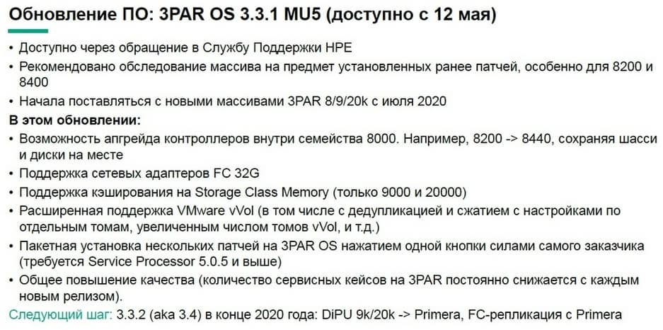 Сейчас вышло обновление для 8000-х, 9000-х и 20000-х массивов 3PAR для операционной системы 3PAR OS 3.3.1 MU5, в конце года появится следующее обновление, которое раскроет еще ряд новых возможностей, которые будут в первую очередь связаны с интеграцией HPE Primera в настроенную и инсталлированную базу 3PAR. Это даст возможность переносить полки расширения с 9000-х и 20000-х 3PAR в HPE Primera и подключать их туда по SAS. Возвращаясь к версии OS 3.3.1 MU5, в которой появилось несколько новых возможностей, среди них можно выделить возможность апгрейда контроллеров внутри семейства 8000. Например, 8200 -> 8400, 8440 или 8450, сохраняя шасси и диски на месте, но контроллеры должны изменяться, поскольку в контроллерах 8200 нет портов для кросс-линка между двумя парами контроллеров. Это уже доступно сейчас к заказу, в китах – сами контроллеры, но к ним нужно покупать сервис для апгрейда, но зато апгрейд происходит без остановки массивов, без остановки доступа к данным и контроллеры меняются по очереди, инвестиции в диски остаются.
