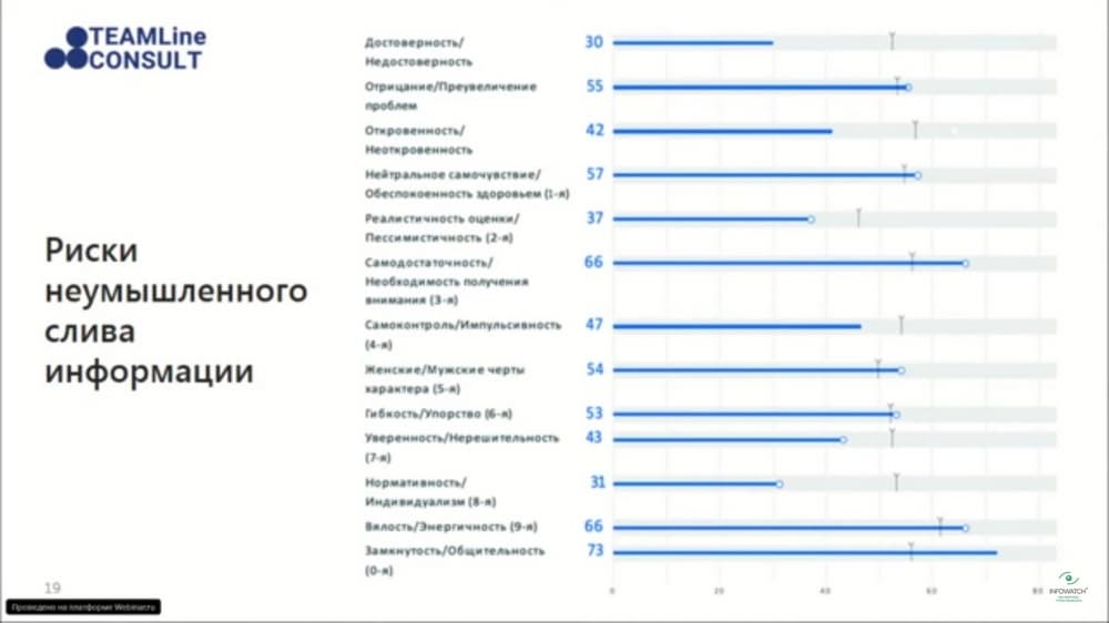 1Есть определенные шкалы, отвечающие за девиантное поведение человека, чем выше шкала, особенно, если коэффициент выше 70 баллов, тем ярче это конкретное качество человека проявляется. 4-я шкала «Самоконтроль/Импульсивность» (там кружок) как раз и отвечает за такое девиантное поведение. В сочетании с низкой 2-й шкалой, а значит у человека нет тревожности, то если он поймет, что информация несет определенную ценность, значит в целом для него совершить определенные противоправные действия не составит определенного труда. Это не говорит о том, что человек обязательно что-то сделает. Все зависит от контекста, от того как организована компания. Сейчас речь идет о потенциале, если у человека есть определенные предрасположенности, если перед ним стоит какая-то цель или ему не будет хватать денег и т.д. Для него что-то сделать вне закона может быть некой нормой, но это не значит что этот риск точно выстрелит, а это для того чтобы ИБ-офицер точечно обратил на такого человека более пристальное внимание «в случае если». Если такой человек будет уходить из организации, то скорее всего с ущербом для этой организации. Тут надо следить за базами данных, за логинами и паролями. Если таких людей разозлить, а они обычно людям не доверяют, для них все остальные люди – враги, тогда определенный ущерб достаточно вероятно может быть нанесен компании.