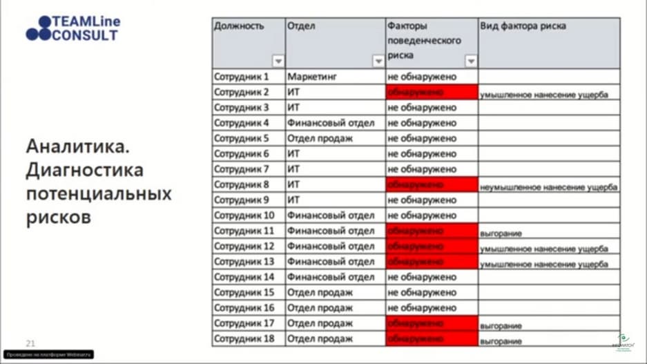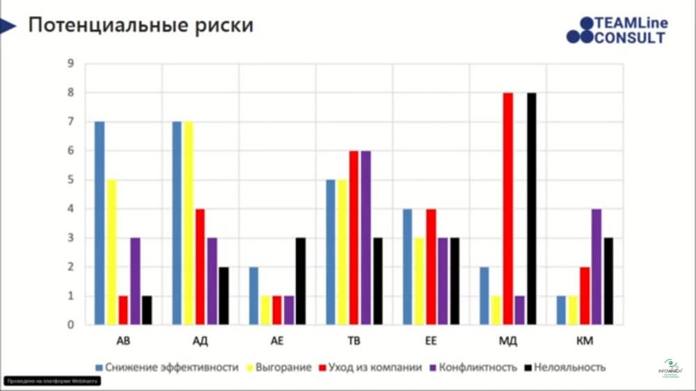 На следующем слайде представлено несколько факторов риска. Снижение эффективности и ее динамика, выгорание, уход из компании, уровень конфликтности, нелояльность тоже влияет на эффективность.