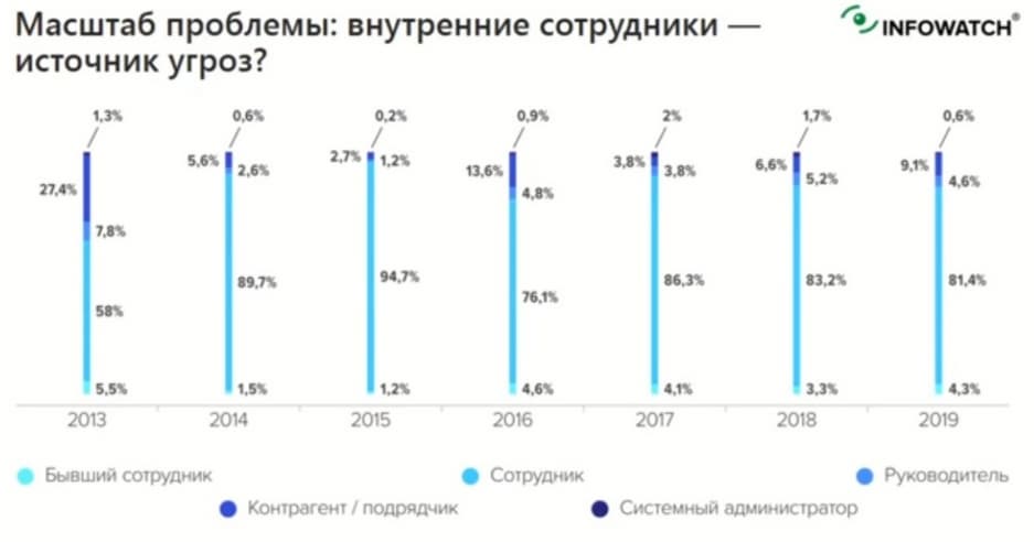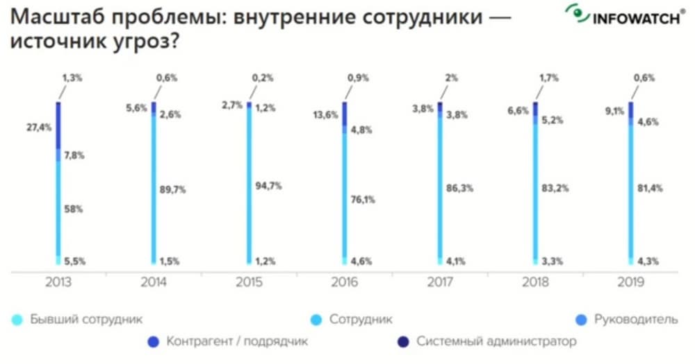 Основным источником внутренних проблем компаний являются обычные сотрудники. Компания – это те люди, которые в ней работают. Эти сотрудники приносят как пользу, так и вносят потенциальные риски своею деятельностью. Мы сейчас живем в кризисные времена с учетом пандемии короновируса, люди так или иначе должны адаптироваться и рисковать, искать варианты выживания, поэтому степень влияния и степень угрозы, которую представляют собой обычные сотрудники в кризисное время, должны возрастать. Как видно по прошлому году порядка 81% всех инцидентов, связанных с информационными угрозами, составляли обычные рядовые сотрудники. Понятно, что они составляют меньше проблем, чем привилегированные пользователи и руководители, но массовость этого явления дает о себе знать.
