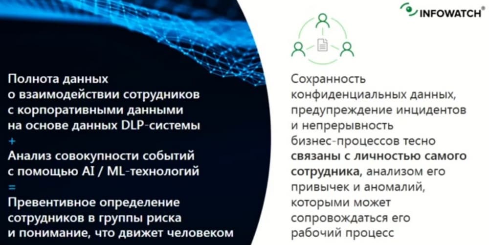 Мы понимаем, что DLP-система, выявляющая только ИБ-инциденты, в современном мире не достаточна. В мире сейчас информационные потоки возрастаю в несколько раз и нагрузка на ИБ-офицеров также во много раз увеличивается, ему нужен инструмент, работающий не только с инцидентами, но и потенциально прогнозирует кто относится к группе риска и фокусирует их внимание на события, связанные с теми или иными людьми.