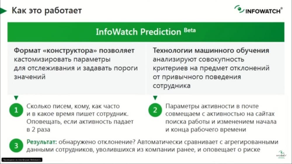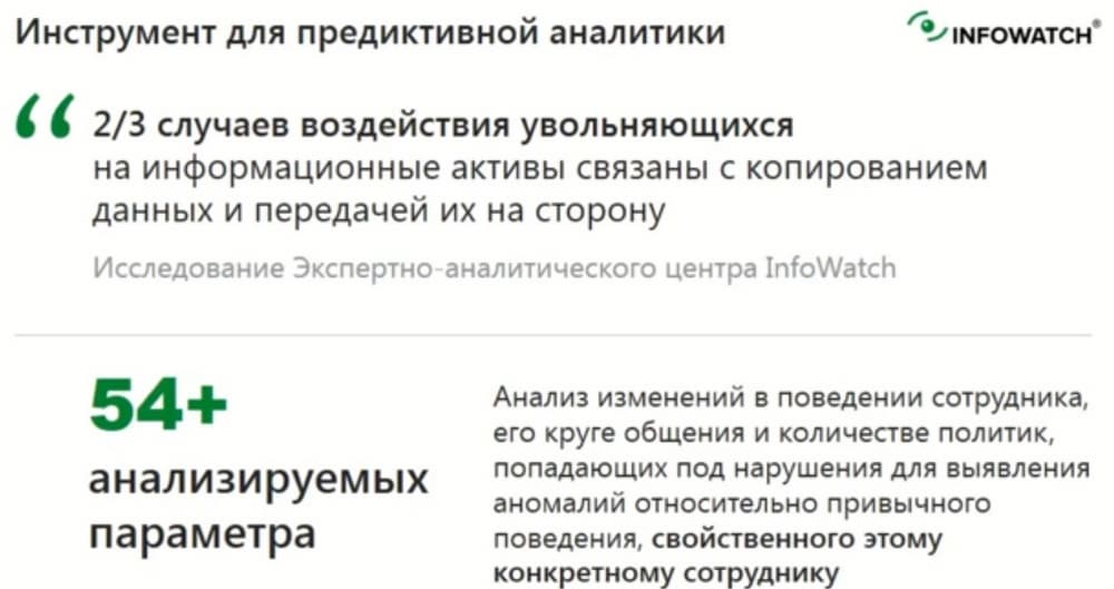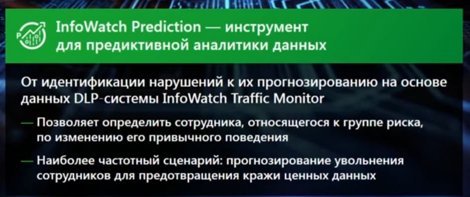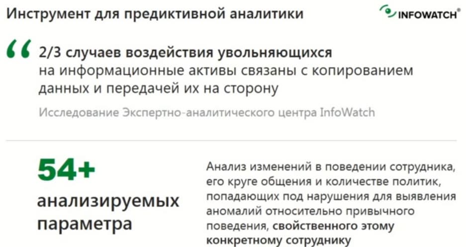 Таким инструментом в случае компании InfoWatch является InfoWatch Prediction. Это продукт, бета версия которого была недавно анонсирована, это инструмент для предиктивной аналитики, анализирующий более 54 всевозможных параметров взаимодействия на основе данных из DLP-системы.
