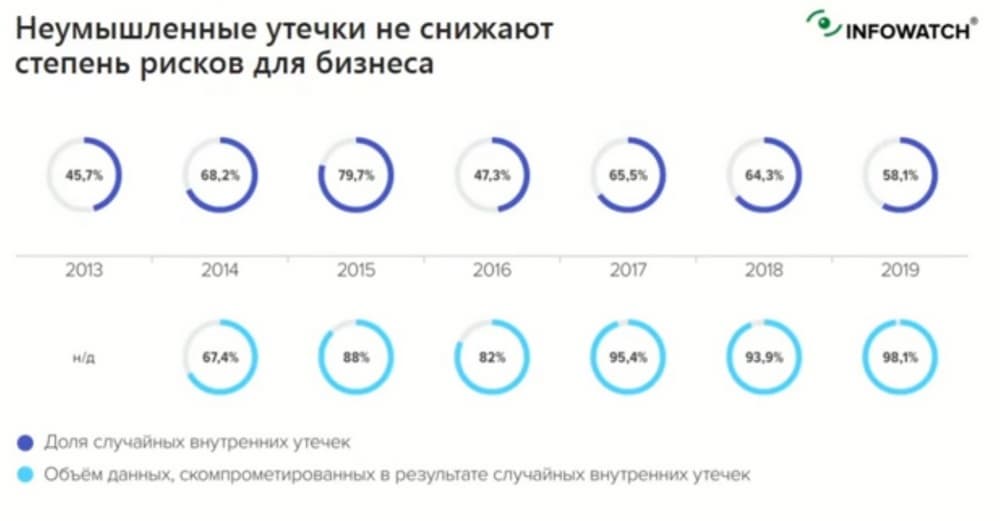 Среди всех зарегистрированных утечек порядка 60% являются неумышленными, т.е. те, которые допускаются сотрудниками необдуманно.