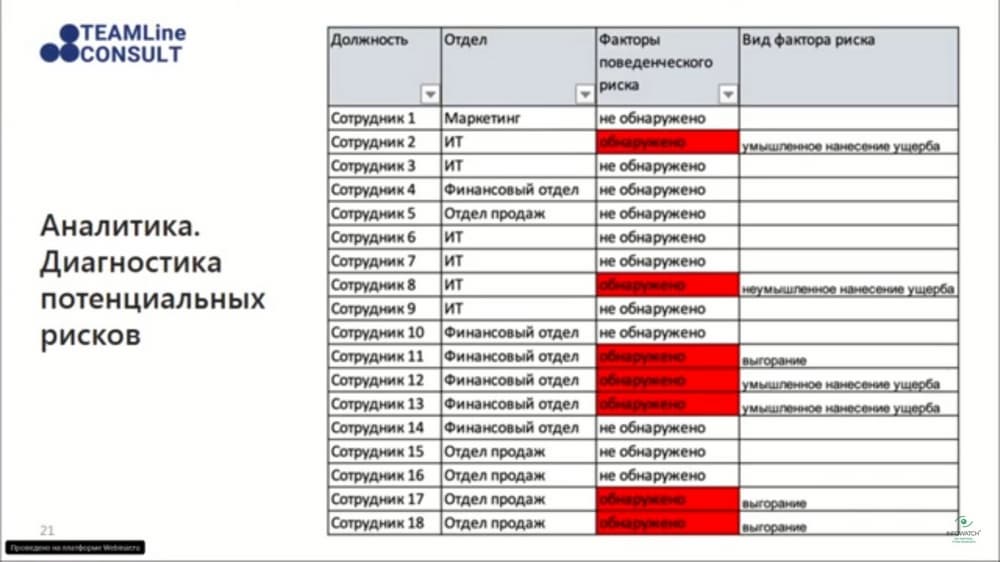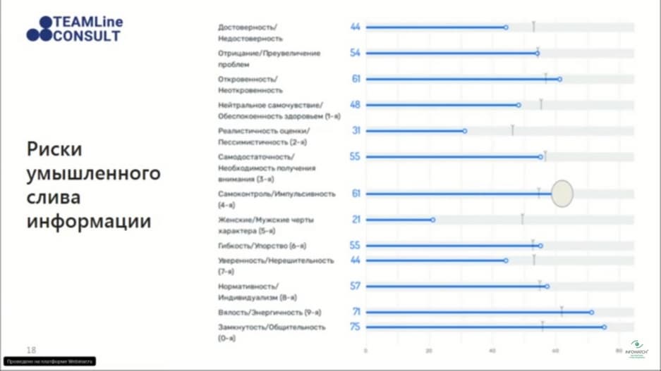 Здесь можно посмотреть поведенческие факторы риска, потому что такие системы как DLP, они великолепно работают и дают возможность оценить какие есть отклонения в поведении, в коммуникациях, но дальше перед HR вставал вопрос - как правильно разобраться с причинами почему человек так себя ведет. И одно из тестирований позволяет на такие вопросы ответить.