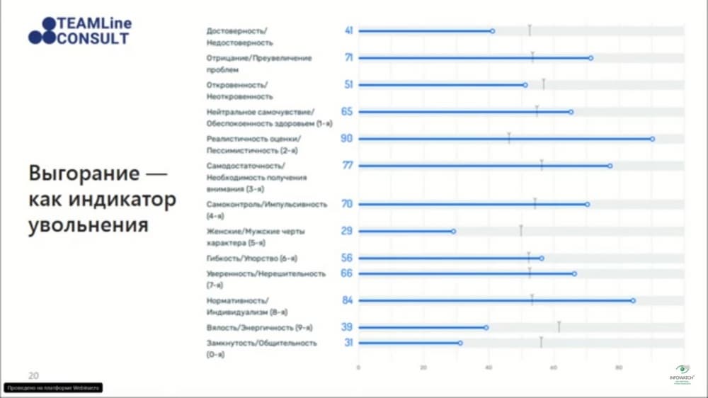 Пиковые показатели в этих шкалах появились в пандемию. Это и не удивительно, поскольку выгорание – это невозможность долгое время справится со стрессом. Само выгорание, как таковое, бизнес не волнует, но надо понимать, как только человек выгорает, эффективность его работы падает, а затем скорее всего следует увольнение: его увольняют либо он сам увольняется. Какие шкалы отвечают за выгорание? Если вторая шкала уходит за 70 баллов – это говорит об устоявшемся депрессивном состоянии, он давно пытается подавить стресс. И есть прямая корреляция между 2-й шкалой и шкалой «Энергичность», которая в норме должна быть 70, а она у него – 39 баллов. Это прямо говорит о выгорании человека. Если посмотреть как у него выполняется KPI, то мы увидим отрицательную динамику. HR следует поговорить с сотрудников, чтобы определить что происходит с человеком и дальше вырабатывать какие-то треки. Таким людям тяжело будет работать на управленческой позиции.