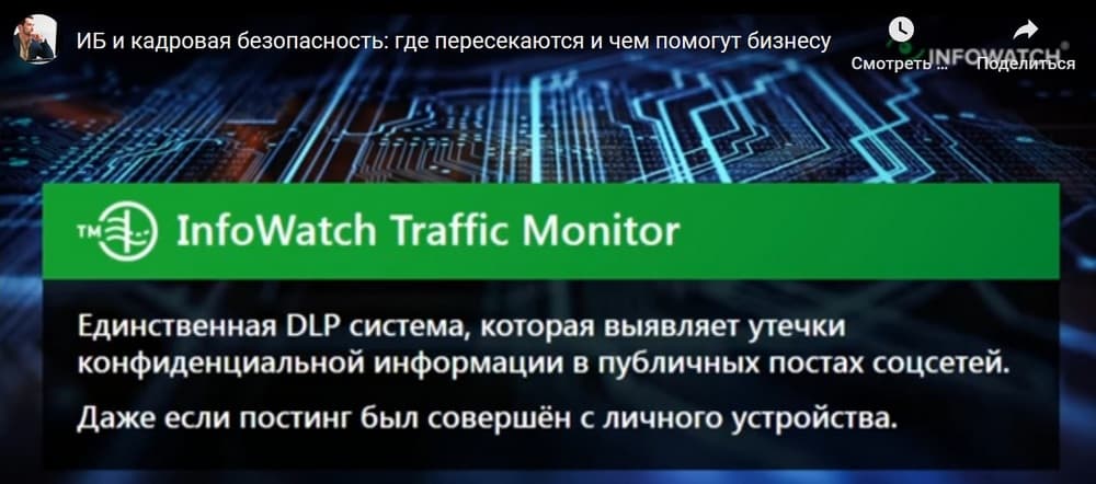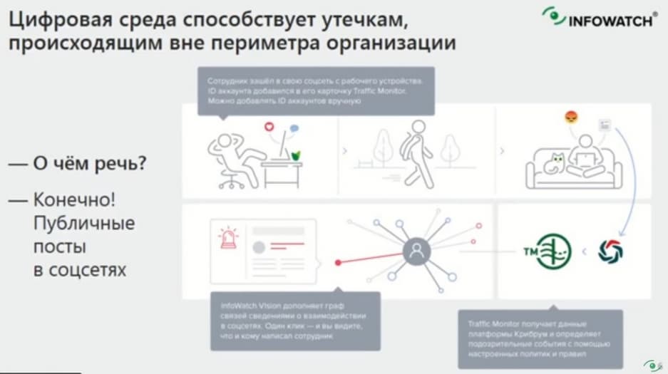 Компания InfoWatch научилась это делать, она сделала интеграцию своей системы с сервисом Крибрум, который занимается мониторингом публичных постов в социальных сетях. Все что нужно офицеру безопасности с точки зрения нашей системы – это правильно настроить правила, идентифицировать интересных ему сотрудников для наблюдения за ними, а потом поставить их под это наблюдение, после чего офицер будет получать полноценную информацию о нарушениях, связанных с публичными публикациями в соцсетях сотрудниками компании. Кроме того, он получит граф связи взаимодействия сотрудников внутри и вне компании, что скорее всего поможет проводить офицеру более качественное расследование и выявлять те или иные инциденты и сговоры. Что важно в этой истории? На данный момент InfoWatch Traffic Monitor является единственной DLP-системой, которая умеет это делать.