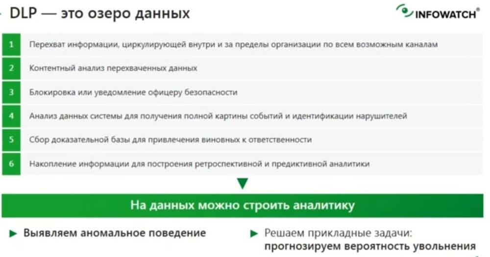 В области DLP-систем часто используется термин Big Data, но по мнению Андрея Арефьева, здесь этот термин не уместен, он скорее применим к таким компаниям как Google, Amazon, Microsoft. DLP-система – это скорее озеро локальных данных, которыми владеет конкретная компания, но которое позволяет решать вполне конкретные прикладные задачи. Эти данные дают возможность осуществлять статический анализ этих данных с привлечением технологий машинного обучения, все это позволяет выявлять группы риска и информировать ИБ-офицера для того чтобы он внимательно следил за поведением этой группы во времени.