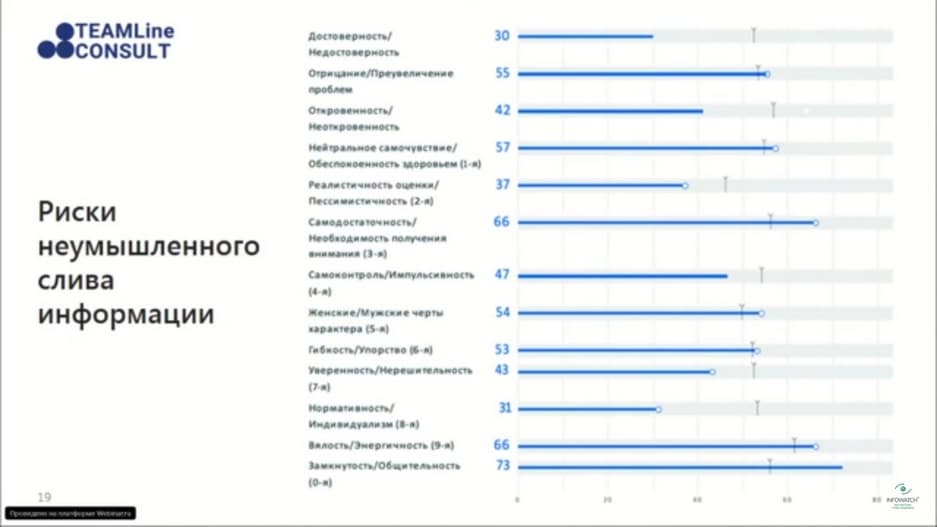 На слайде можно посмотреть на пиковые показатель по шкале номер 3 – «Необходимость получения внимания», те люди, для которых очень важно получать внимание, они очень общительны, они как раз и являются самыми яркими звездами на просторах социальных сетей. Таким людям очень опасно доверять конфиденциальную информацию, потому что они открыты, если у них что-то спросят, то они не хотят выглядеть как-то невыгодно, они не будут говорить, что они что-то не знают, все что знают, очень вероятно - расскажут. На эти шкалы надо обращать особое внимание. Этот инструмент, играющий как оркестр, все же в нем 13 шкал-инструментов, здесь есть важные 3 шкалы, которые чаще всего показывают интересную и достоверную картинку. Здесь встроен своеобразный детектор лжи, это первичные 3 шкалы, но самая сильная из них – это первая шкала сверху. Если показатель более 70-ти баллов – это значит этот человек нам уже целенаправленно врал, он не лоялен. Здесь «достоверность» – 30 баллов, значит результаты тестирования достоверны, значит человек отвечал честно и у него нет в этой модели патернов скрывать информацию. Чем выше шкала недостоверности в организации с работающими сотрудниками, тем ниже эффективность и лояльность. Если же мы берем человека на работу и у него на входе недостоверные показатели, то, если есть конкурс среди людей, то лучше взять другого человека, Если человек врет на входе, значит будет врать в принципе, это его нормальное поведение. Но здесь картина другая, здесь супероткрытый человек, он максимально откровенен, ему очень важно казаться хорошим и при этом он зависим от мнения окружающих, у него высокая потребность в общении, такие люди как раз становятся жертвами социнженеров, выуживающих информацию специальными методами воздействия на людей, втираясь к ним в доверия, задавая вначале различные отвлеченные вопросы. Как вызвать у такого человека доверие? Надо сначала его похвалить: как вы замечательно работаете, как вы таких результатов добились?.. и т.д. И затем с такого человека можно снимать практически любую нужную информацию.