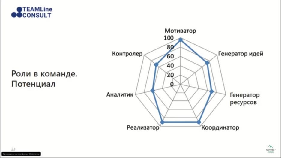 Роли в команде можно оценивать с помощью комплексного тестирования. На вышерасположенном слайде оценивается сотрудник. Он хорошо может мотивировать, координировать и реализовывать, у него все отлично с коммуникациями и с лидирующими качествами, а вот там где нужно что-то проконтролировать, сесть, посидеть и подумать, проработать стратегию, придумать новые идеи, тут скорее всего у него будут сложности. Тут понятно где этого человека можно эффективно задействовать, он отличный мотиватор, он хорошо может начать проект, собрать для его реализации команду, это точно – для него.