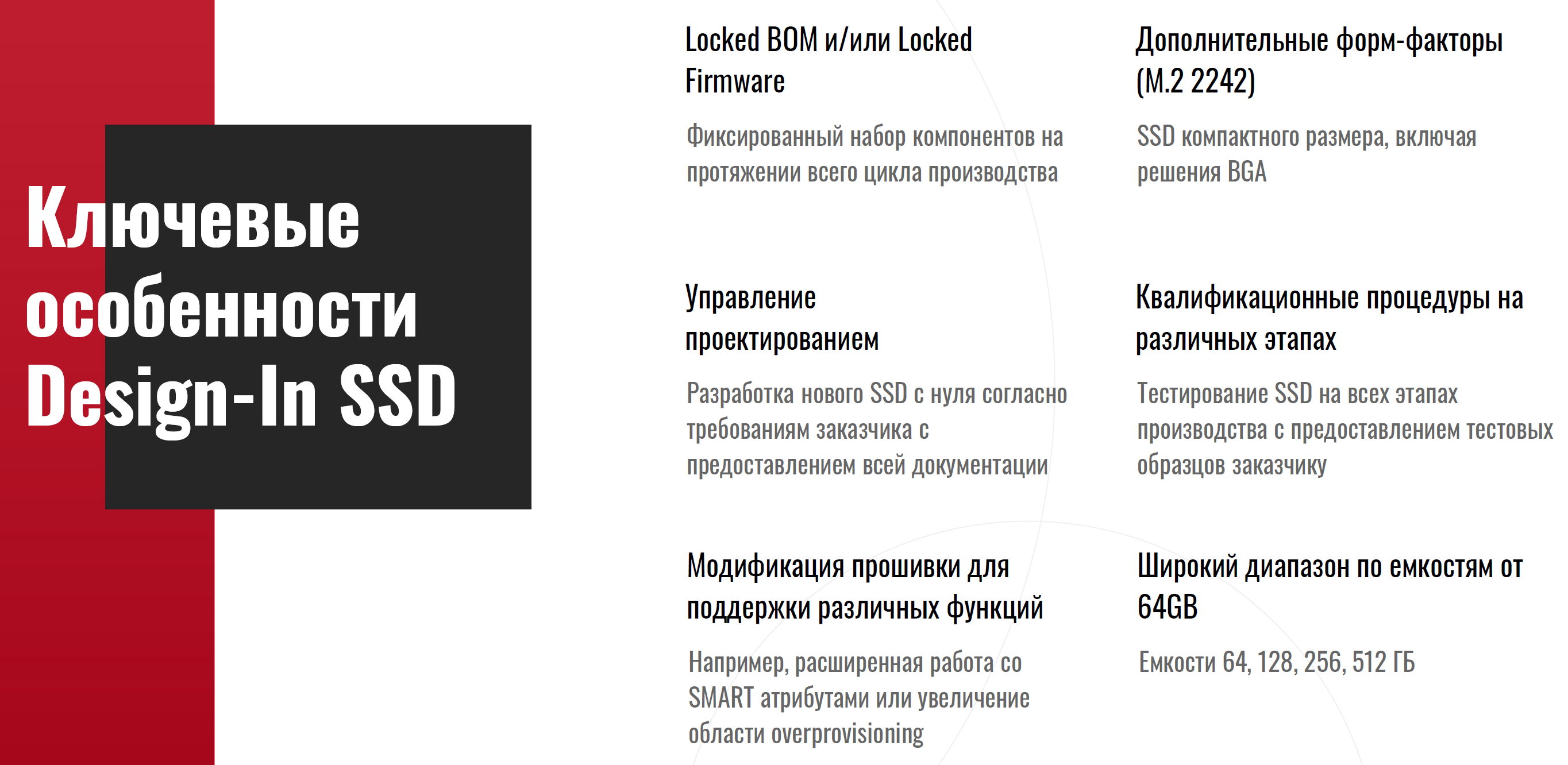 Однако это далеко не единственное и даже на основное преимущество, которое дает Design-in SSD. Самое интересное в ней — это, конечно, возможность адаптировать накопители под собственные задачи: от определения набора используемых компонентов и модификации прошивок до модификации упаковки и внешнего вида корпуса, изменения атрибутов SMART и так далее.
