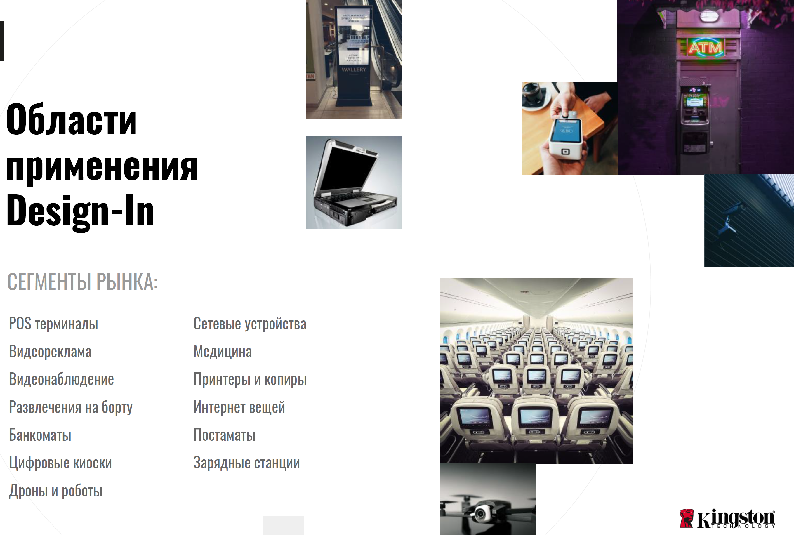 В ее рамках представители бизнеса могут обеспечить себя устройствами с фиксированным набором компонентов и стабильной прошивкой, которые всегда будут доступны и готовы закрыть потребности в расширении парка дисков или их замене. Естественно, что в первую очередь это актуально для предприятий, использующих сравнительно много устройств с SSD, на иллюстрации ниже представлен список возможных сфер, где Design-in SSD особенно актуален по мнению самих Kingston.