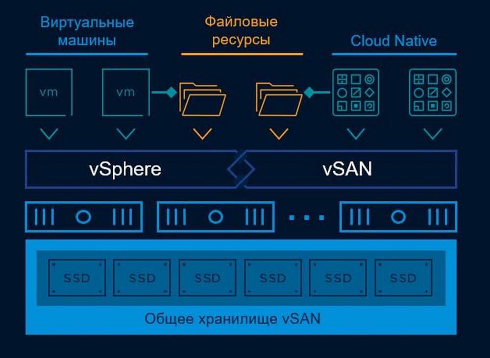 Теперь более подробно рассмотрим программное обеспечение VMware. vSAN — это ПО корпоративного класса для виртуализации хранилища, которое в сочетании с vSphere дает возможность управлять вычислительными ресурсами и хранилищем с помощью одной платформы. vSAN помогает упростить традиционное хранилище и снизить расходы на него, а также облегчает переход к гиперконвергентной инфраструктуре (HCI) и гибридному облаку.