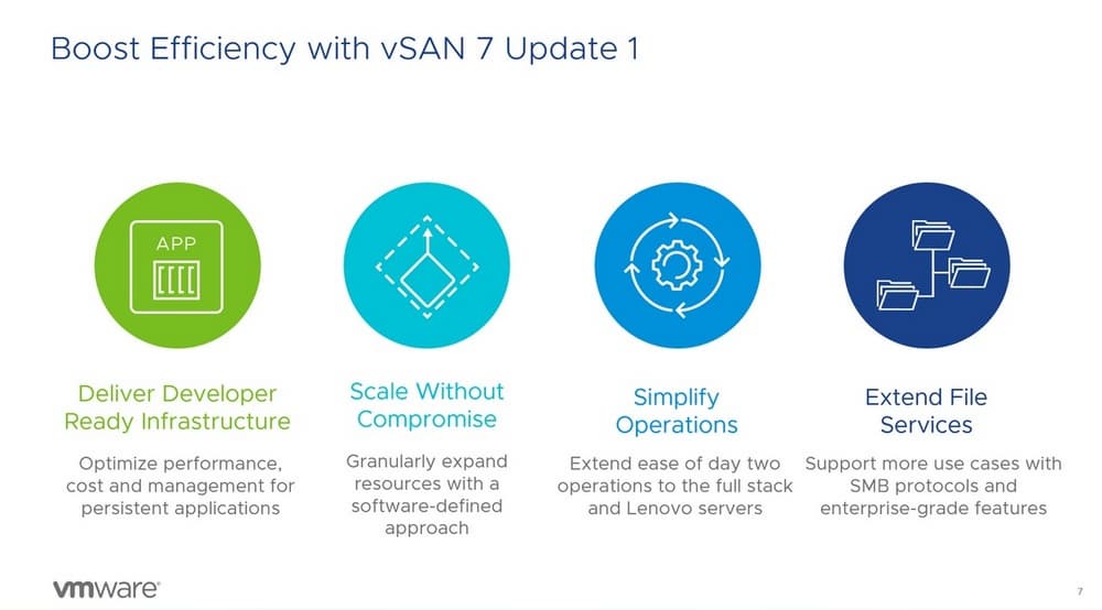 В сентябре 2020 года компания анонсировала обновление vSAN 7 Update 1 (U1). Оно обеспечивает основу для полностью программно-определяемой платформы хранения и виртуализации. Поскольку vSAN интегрирован непосредственно в гипервизор, все новые функции добавляются за счет обновления гипервизора до версии vSphere 7 U1.