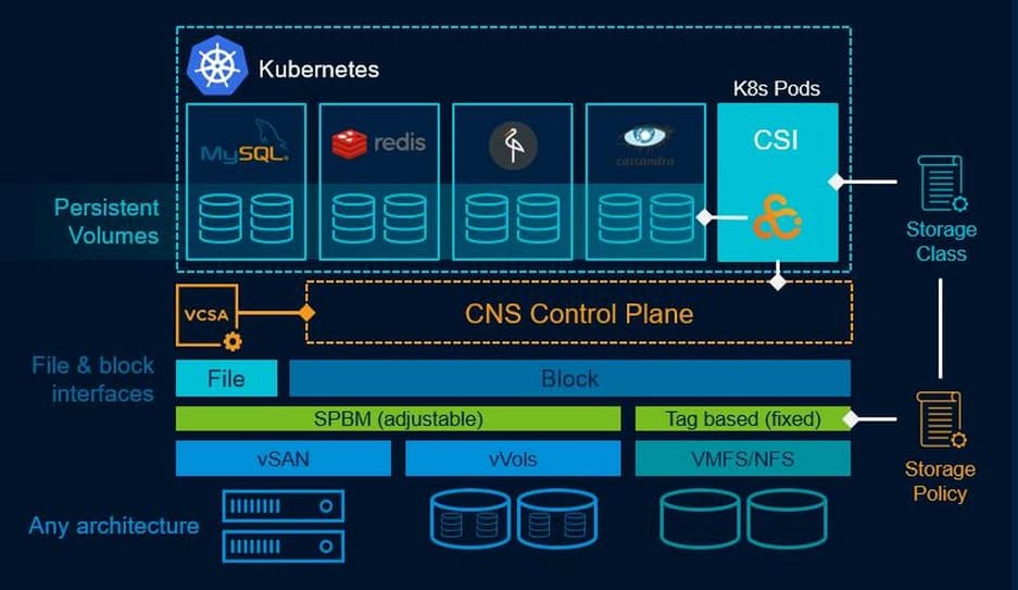 vSAN предоставляет собственный уровень управления для контейнерного статичного хранилища, позволяя разработчикам использовать ресурсы хранилища с помощью существующих инструментов, а администраторам управлять посредством привычных продуктов VMware — vSphere и vCenter.