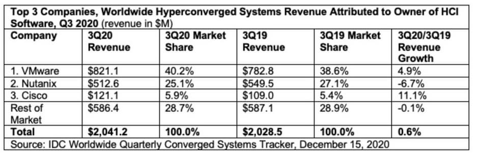 Системы HCI, основанные на решении VMware vSAN, занимают лидирующее положение на рынке в III квартале 2020 года согласно информационному ресурсу IDC Worldwide Converged Systems Tracker («Глобальное отслеживание конвергентных систем, выполняемое компанией IDC»).