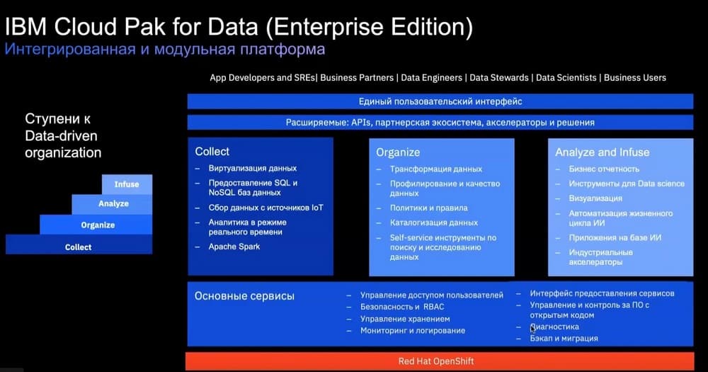 Сегодня речь пойдет о Cloud Pak for Data. Это физически реально один интерфейс пользователей вне зависимости от того, какую роль этот пользователь выполняет. Начиная от базового администрирования источника хранения данных до бизнес-приложений.