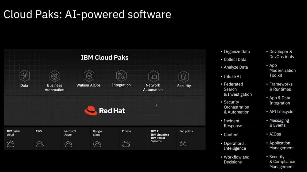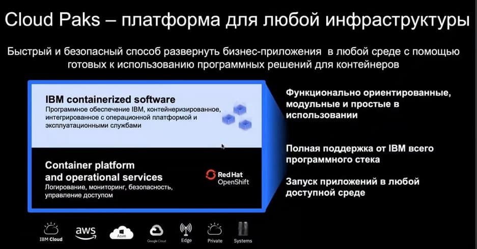 По словам Романа, IBM конвертировал продуктовое предложение в портфолио продуктовых решений в области ПО, конвертировал в понятные технологические доменные продукты и назвал их Cloud Pak. В этом термине слово Cloud не означает SaaS, не означает публичного облака, оно в этом контексте – имя собственное (название продуктовой линейки), здесь не говорится о какой-то технологии или инструменте, здесь скорее говорится о потенциальной возможности развертывания решения там, где заказчику удобно, потому что решение контейнеризовано и реализовано с использованием микросервисной архитектуры.