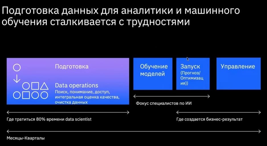 Если есть желание на практике применять инструменты ИИ, анализ данных, все равно нужно организовывать весь ландшафт систем хранения данных, операционный уровень работы с данными, который связан с Organize и Collect.
