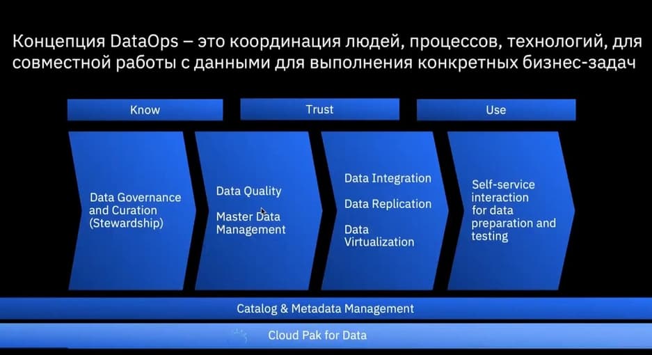 Теперь эта концепция называется DataOps, здесь осуществляется связка от хранения, управления данными через их очистку и работу с данными по определенным параметрам, в частности посредством Master Data Management, т.е. интеграции и репликации данных. И в конце концов приходит Self-Service Iteration для подготовки и тестирования данных, когда самим пользователям, при создании отчетов не нужно заказывать те или иные данные, они это делают самостоятельно.