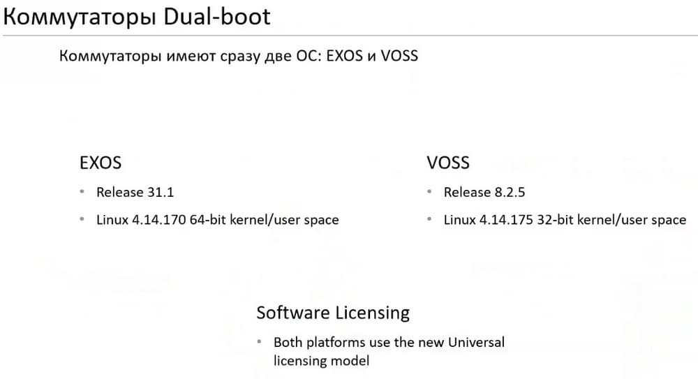 Вы в любой момент, покупая эти коммутаторы, можете решить какую операционную систему вы хотите использовать, ОС EXOS с ее фичами, включая стекирование либо вы хотите использовать фабрику и выбираете операционную систему VOSS, при этом все коммутаторы становятся полностью фабричными. Это можно сделать в любой момент, но при этом стирается конфигурация коммутатора. При большом проекте можно сначала поставить коммутаторы в режим стекирования, потом перевести сеть на это оборудование и все перегрузить в фабрику и у вас получится полноценная фабрика. Даже лицензии все покупаются только один раз и действуют на обе операционные системы.