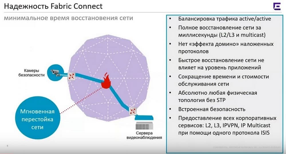При добавлении любого другого коммутатора доступа или замены старого коммутатора, все это легко осуществляется и Fabric Connect это достаточно просто подхватывает. Теперь не нужны специальные технологические окна для настройки ядра. В этой фабрике есть балансировка трафика, обеспечивается быстрое восстановление сети, для обеспечения отказоустойчивости может использоваться несколько ядер.